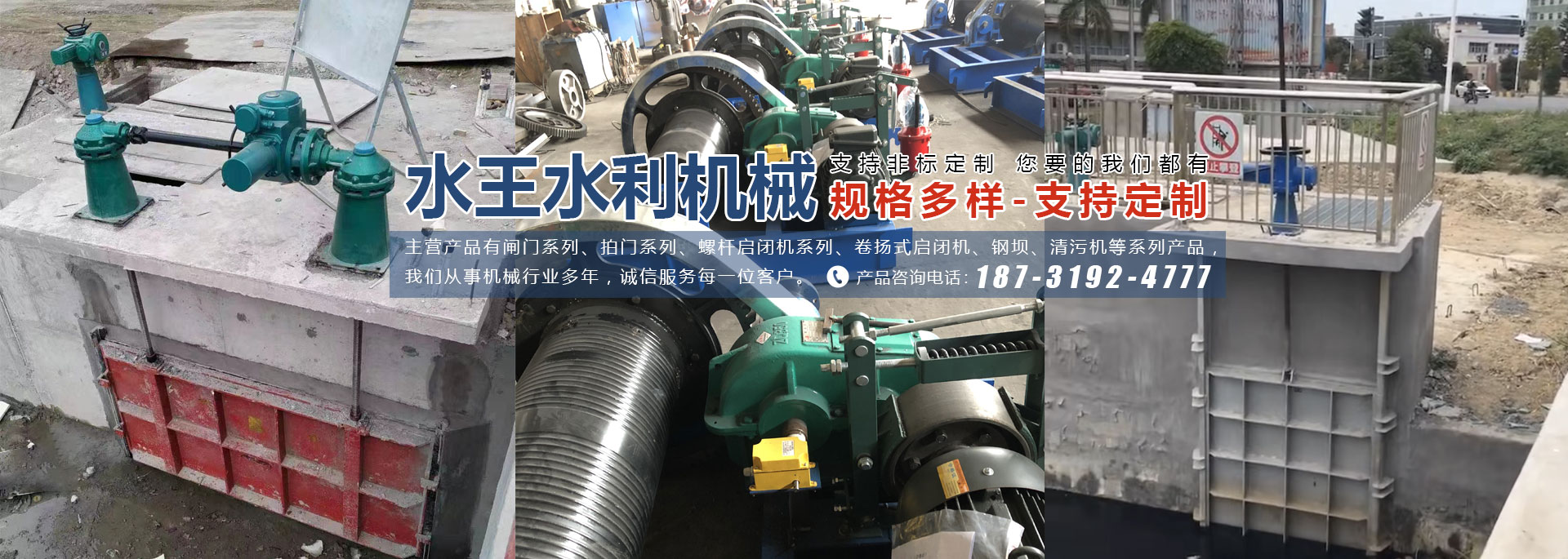 主营产品有闸门系列、拍门系列、螺杆启闭机系列、卷扬式启闭机、钢坝、清污机等系列产品。
